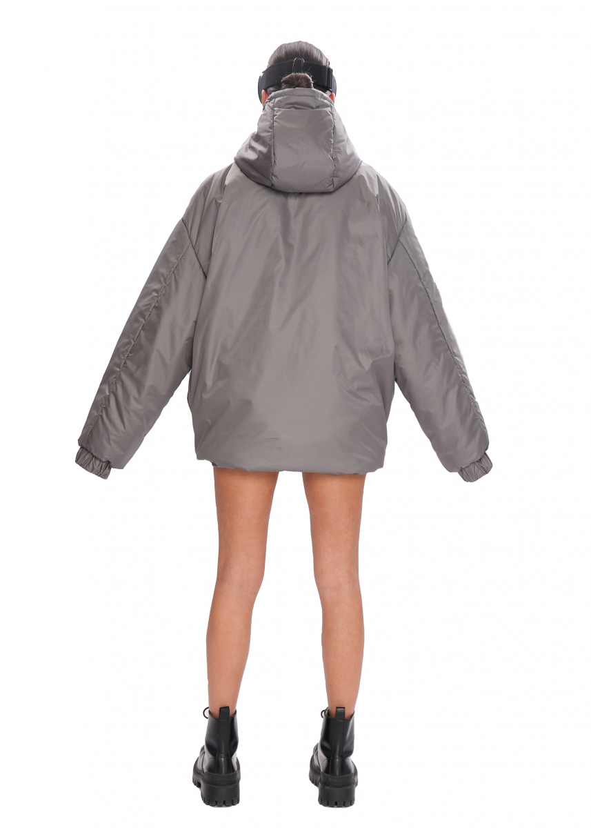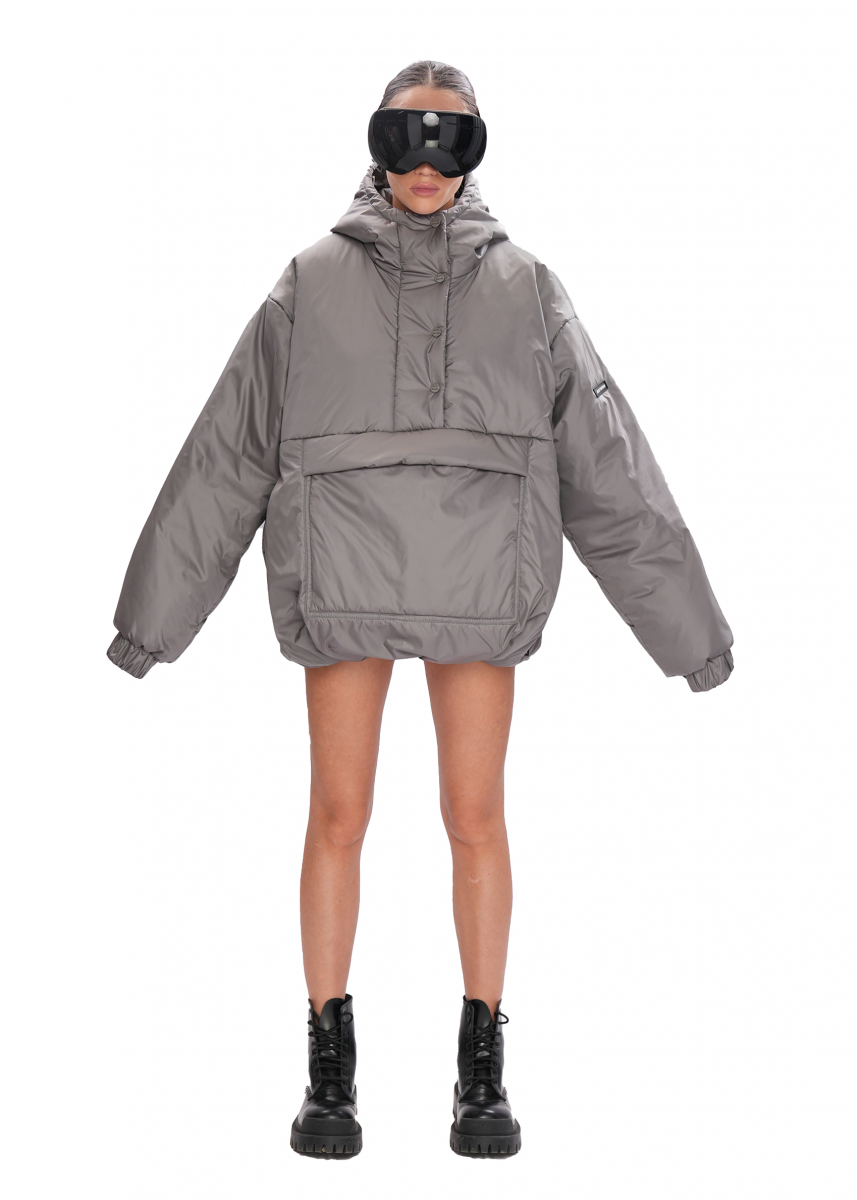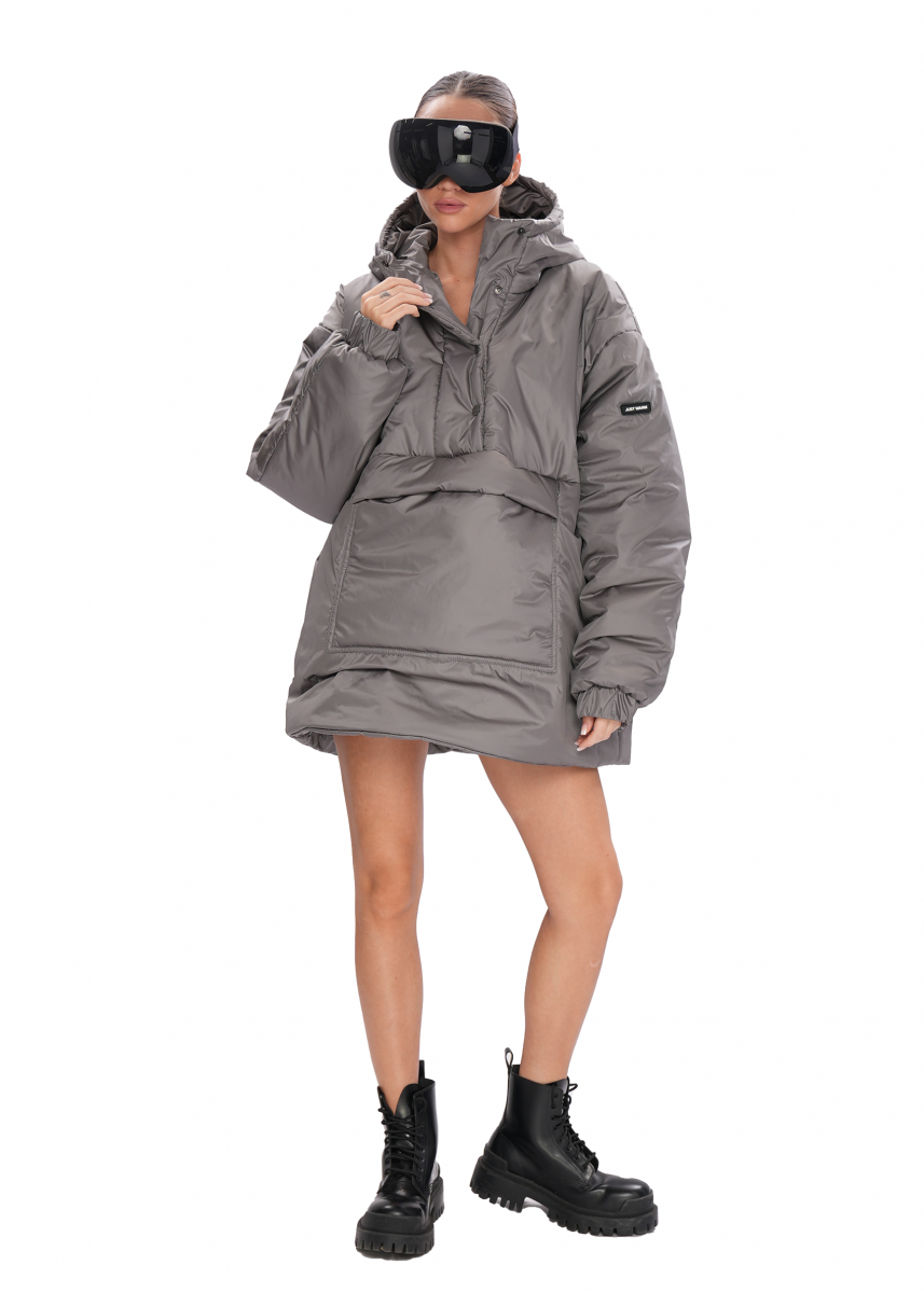 Анорак имеет удобный большой карман и стильные металлические кнопки в передней части, объемный утепленный капюшон и фиксаторы в рукавах и нижней части, которые позволяют менять силуэт и защищают от продувания.