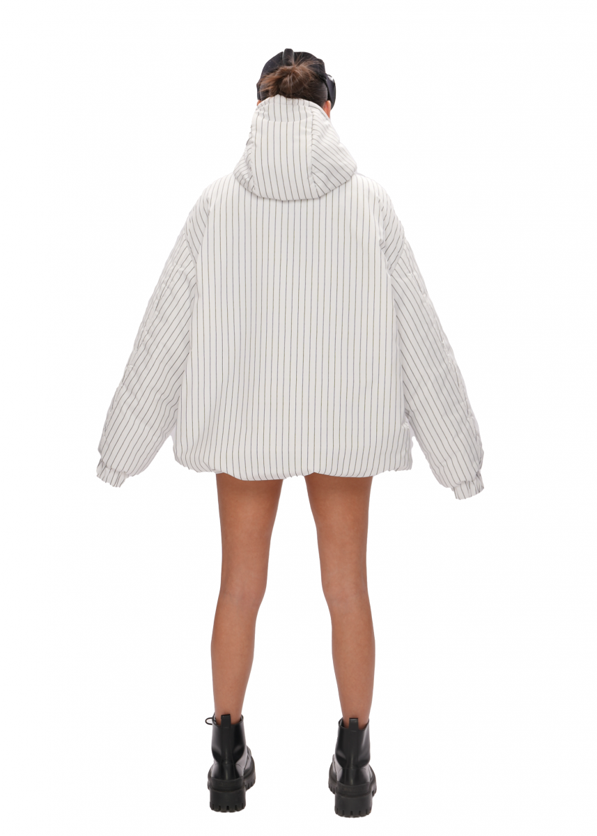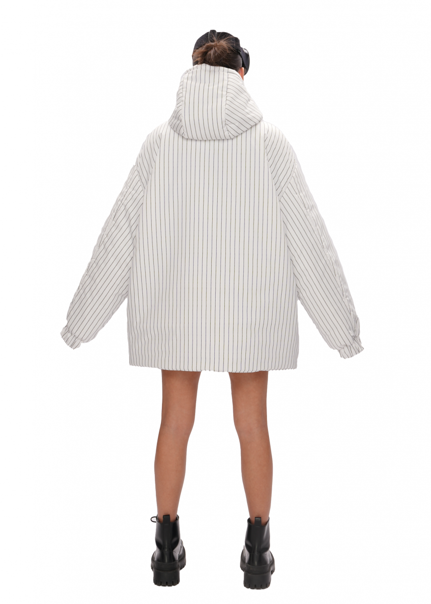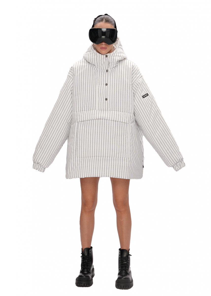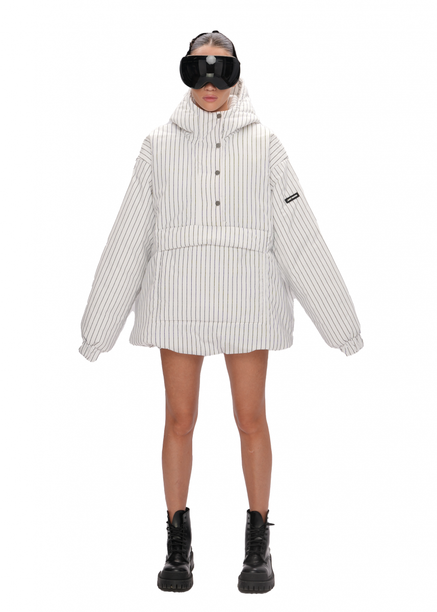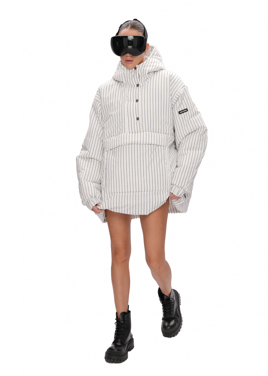 Анорак имеет удобный большой карман и стильные металлические кнопки в передней части, объемный утепленный капюшон и фиксаторы в рукавах и нижней части, которые позволяют менять силуэт и защищают от продувания.