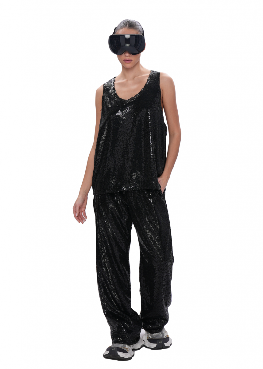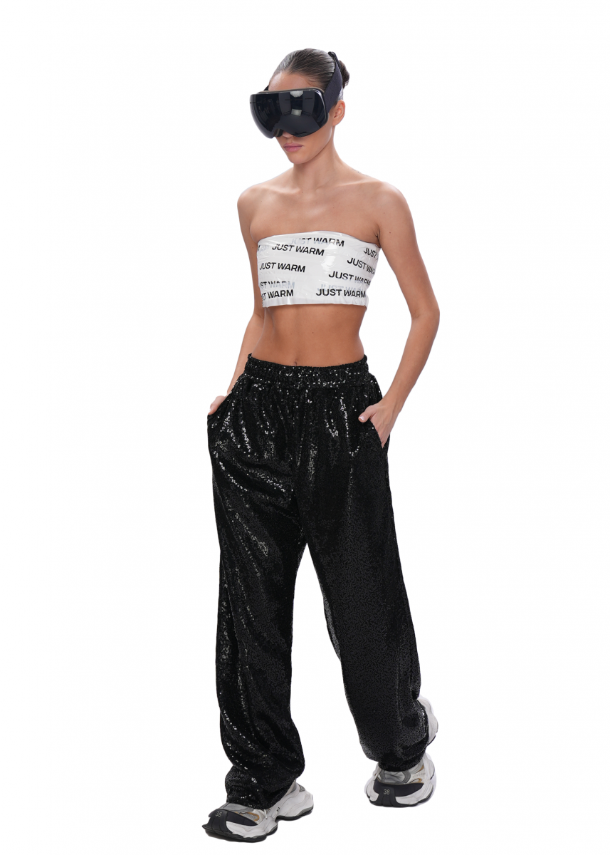 Брюки GLOW с пайетками — практичная и стильная модель с прямым кроем. Верх на резинке обеспечивает удобную посадку, а фиксаторы внизу позволяют регулировать длину. Внутренний брендированный подклад предотвращает колкость, обеспечивая максимальный комфорт. Идеально для создания стильного вечернего образа.