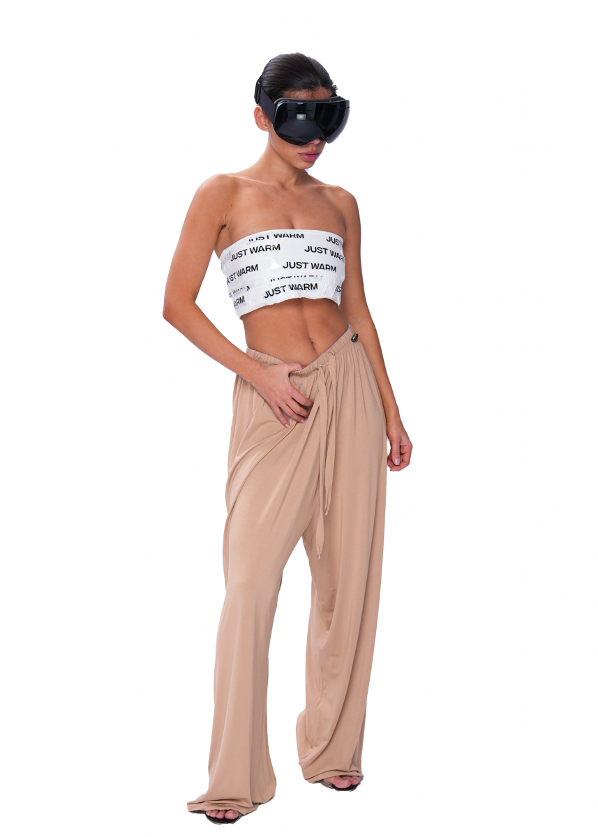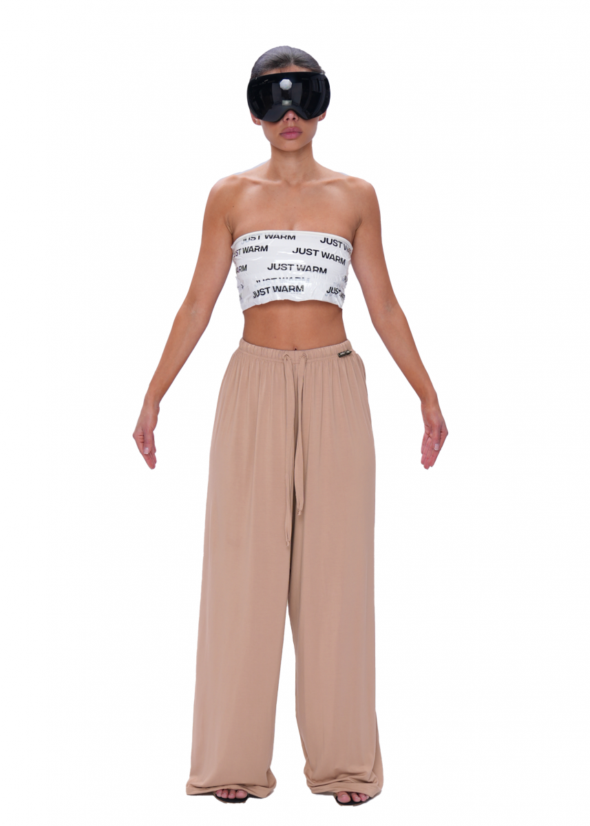 Тонкая эластичная резинка на талии деликатно прилегает к фигуре, а регулируемые шнурки позволяют настроить посадку. Благодаря продуманному силуэту модель гармонично вписывается как в повседневные городские образы, так и в расслабленные домашние и в комплекты для пляжного отдыха.