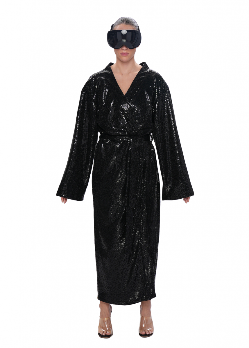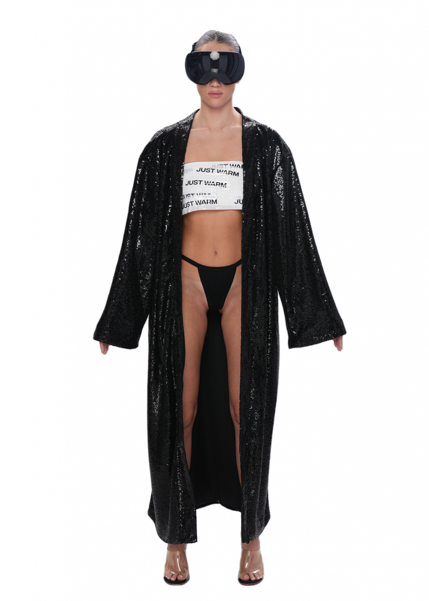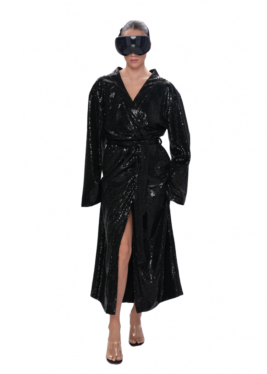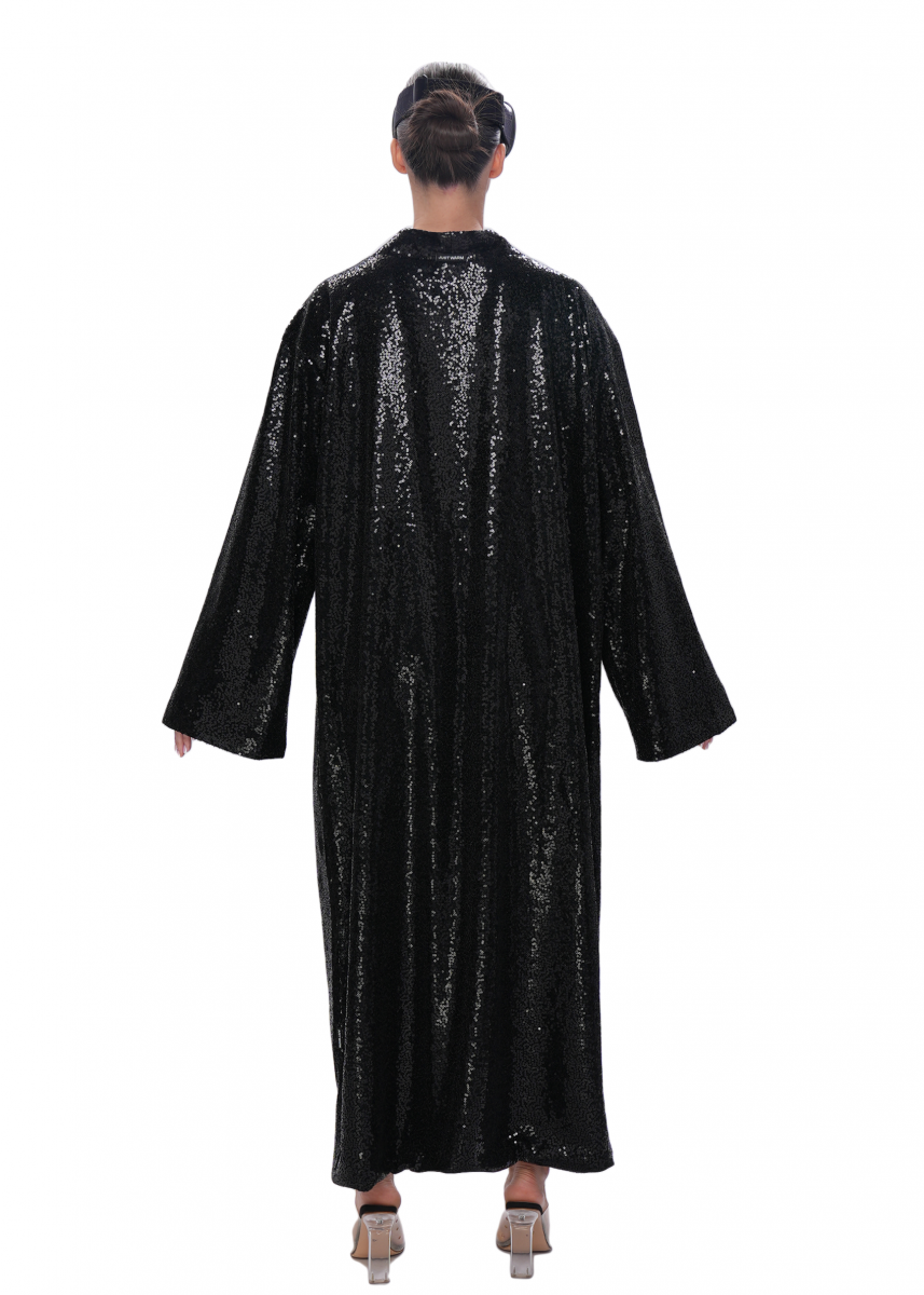 Свободное кимоно из россыпей мелких пайеток — эффектная вещь для ярких вечерних образов. Модель выполнена в расслабленном силуэте и дополнена мягким поясом, позволяющим подчеркнуть талию. Внутренняя отделка — гладкий шелковый подклад, обеспечивающий комфорт и приятные тактильные ощущения. Блестящая фактура ткани ловит свет под любым углом, создавая впечатляющий, праздничный акцент в вашем гардеробе.