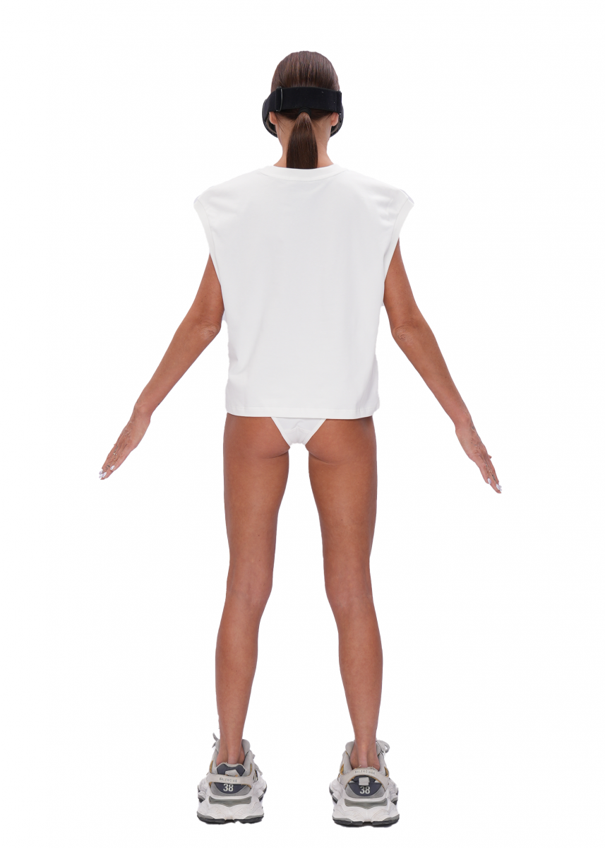 Верхний слой - укороченный топ оверсайз силуэта, имеет широкие плечевые вырезы, отлично подходит для носки и сочетания с летними обазами в жаркие дни, а так же поверх рубашек и лонгов для многослойных образов.