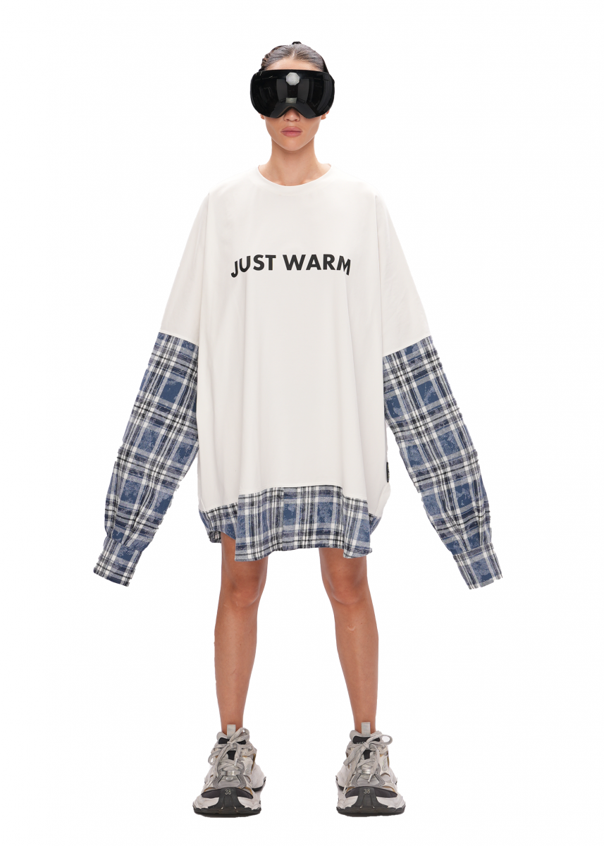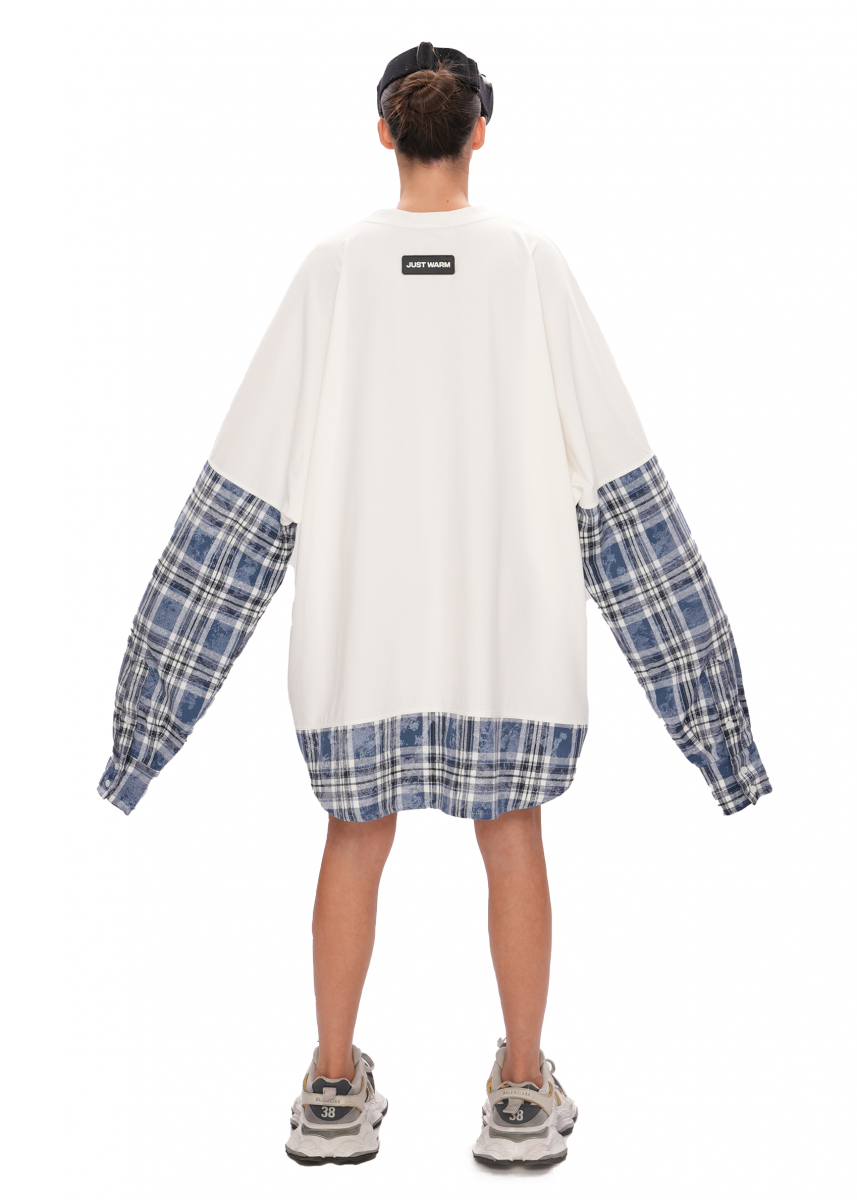 Многослойный лонгслив выполнен из хлопковой кулирки. Изделие имеет рубашечные вставки в клетку в рукавах, что придает ему уникальный вид. На лицевой стороне нанесена стойкая печать в виде фирменного логотипа. Лонгслив подходит мужчинам и женщинам, в едином размере SUPER OVERSIZE.