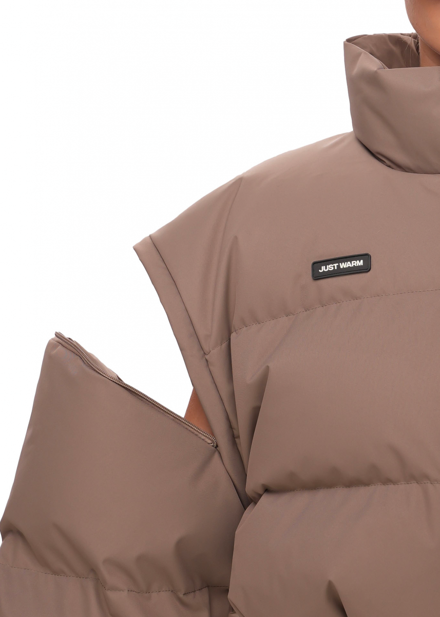 Благодаря съемным карманам на молнии, вы можете легко менять силуэт изделия, трансформируя мини-пуховик в теплый жилет.