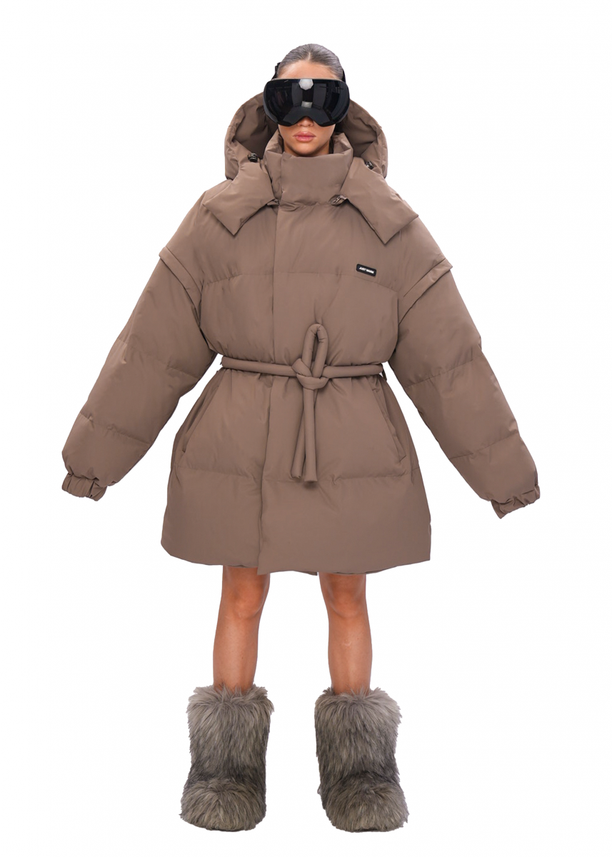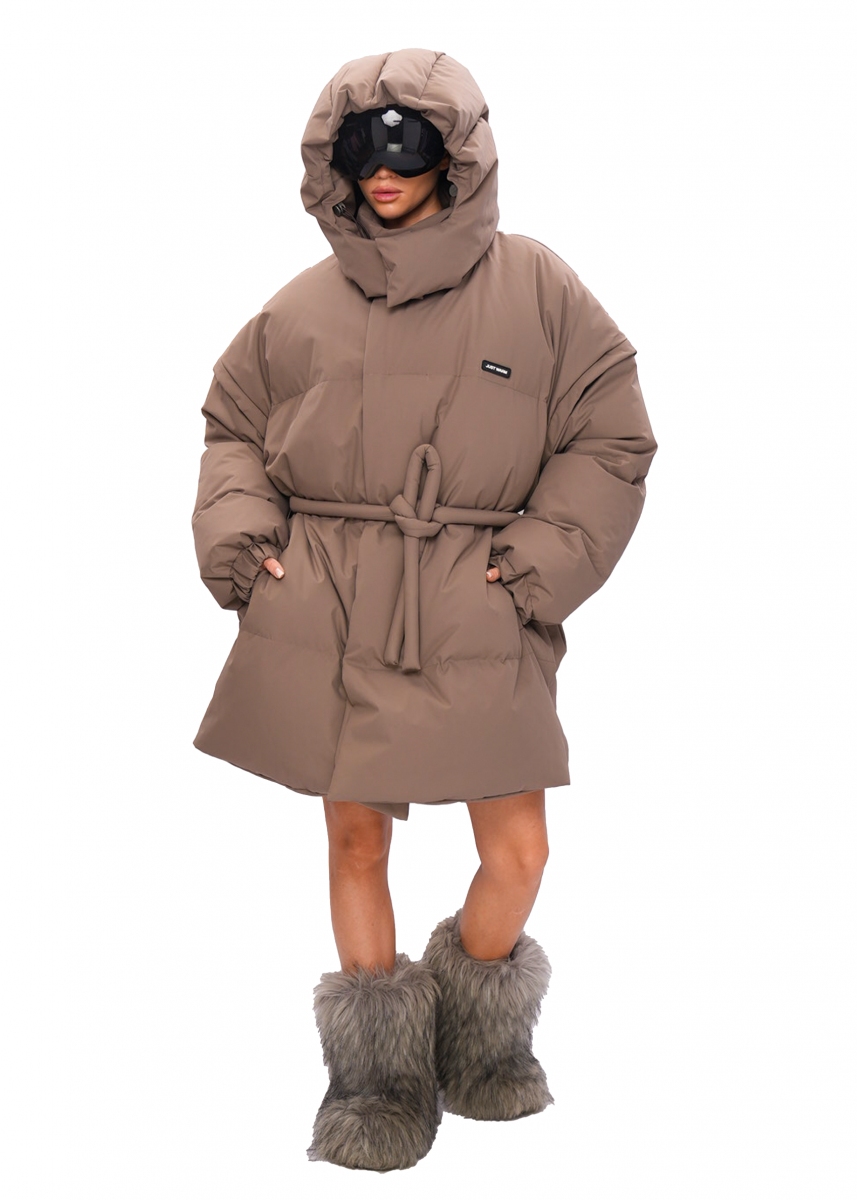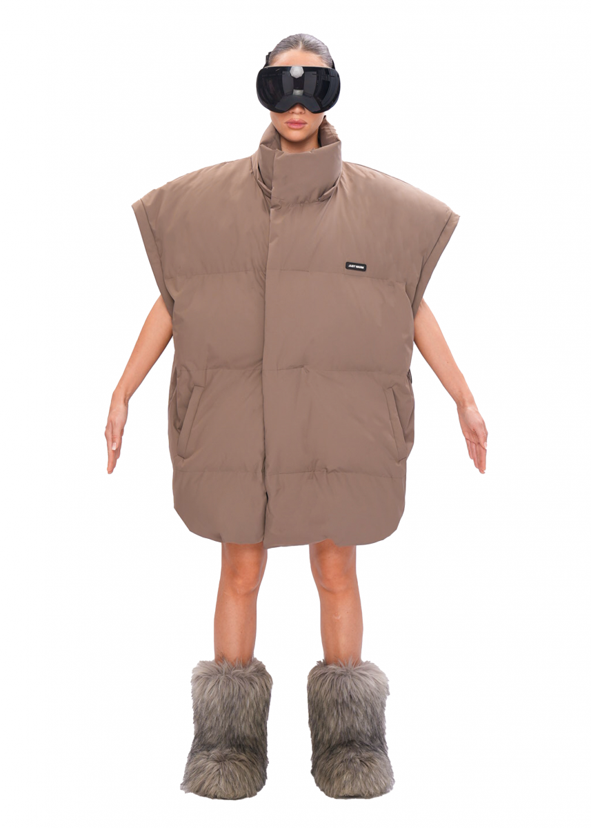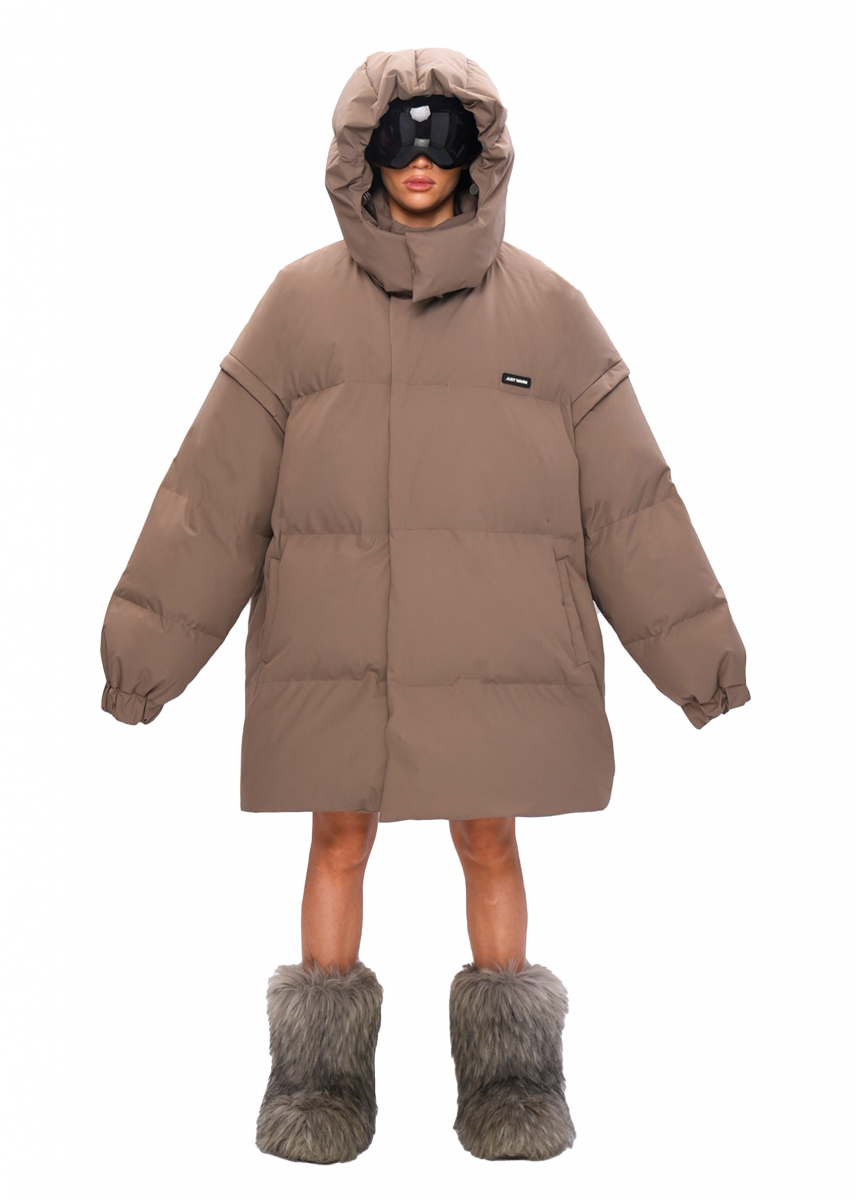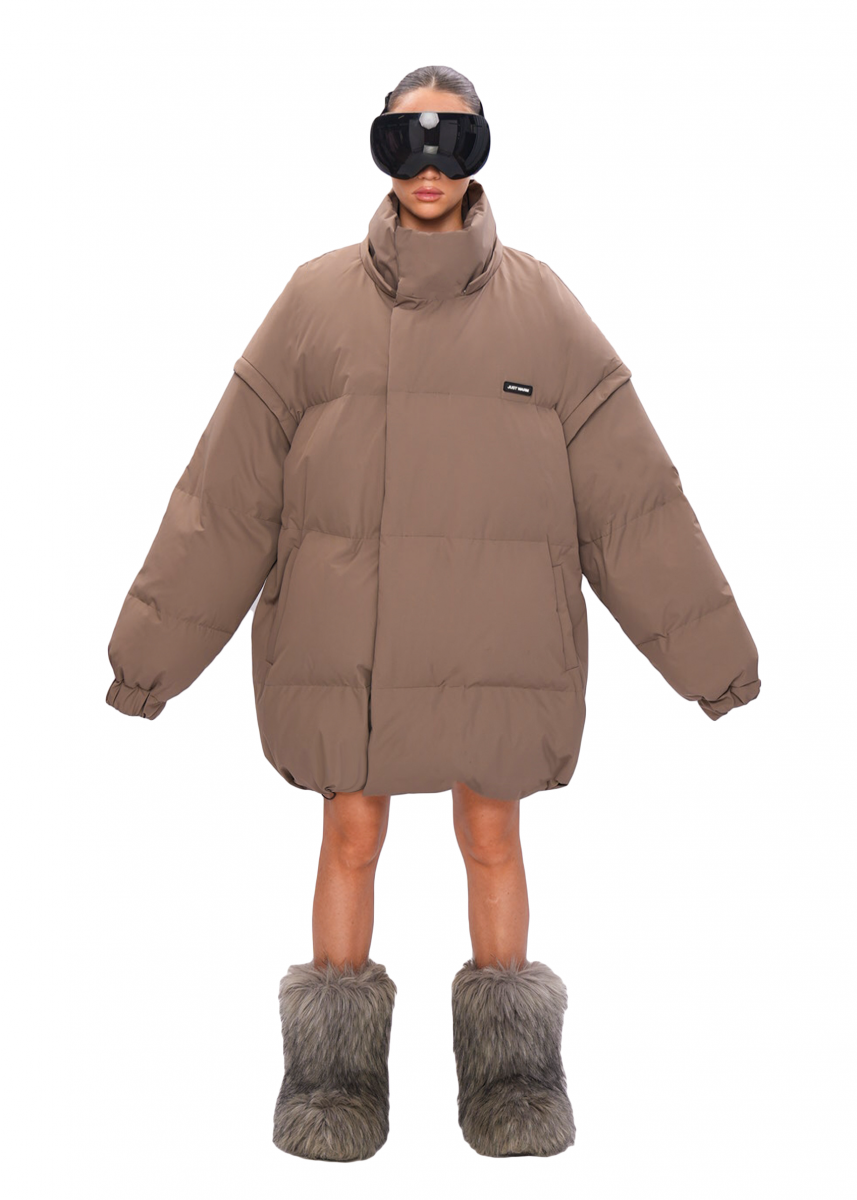 Непродуваемый пуховик имеет super oversized силуэт, а также оснащен высоким воротником, съемными рукавами, внутренними карманами и объемным непродуваемым капюшоном.