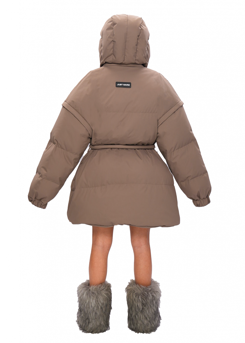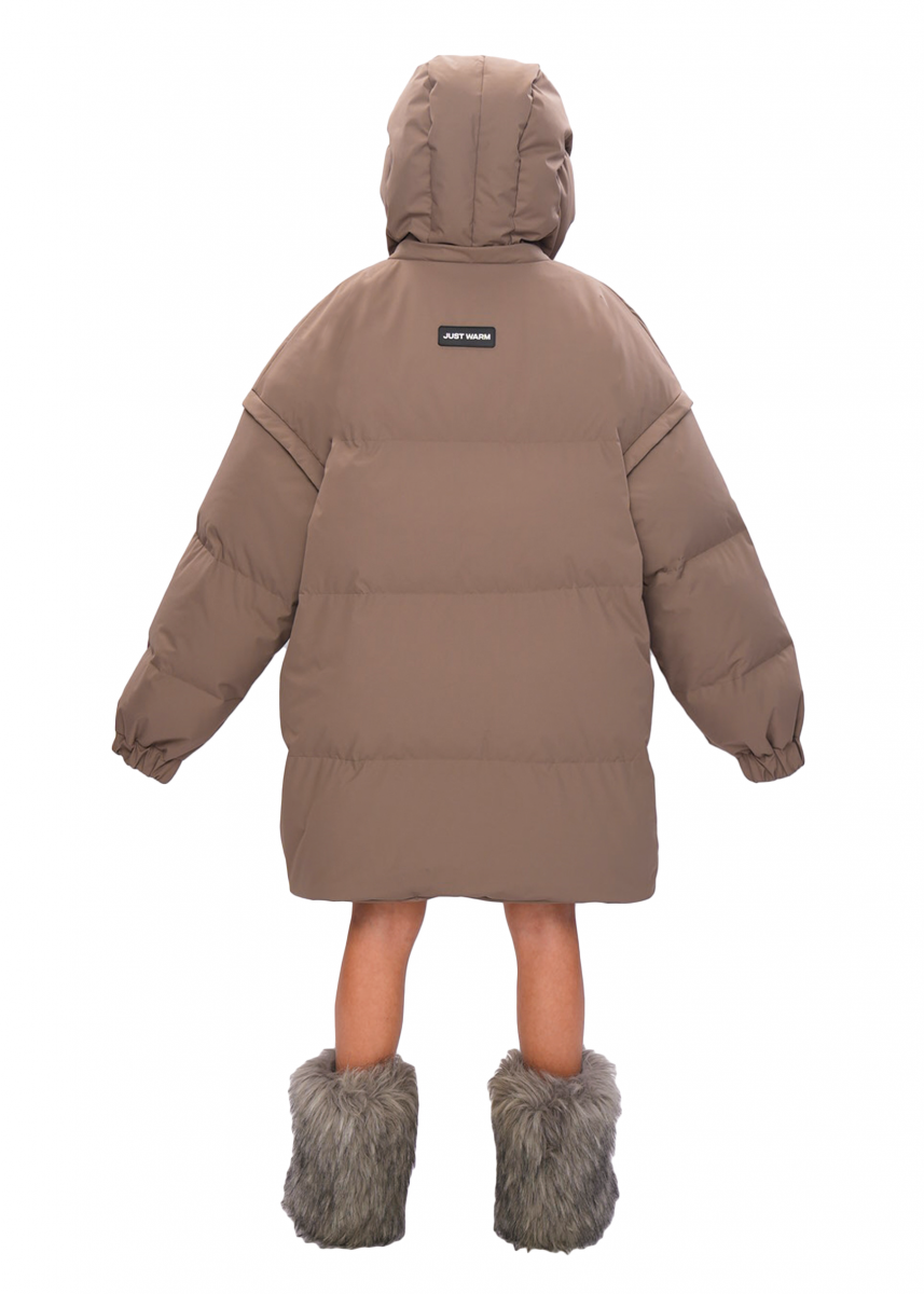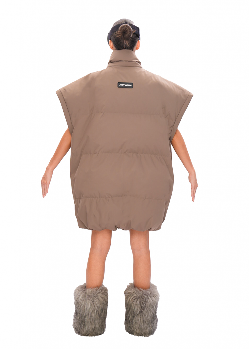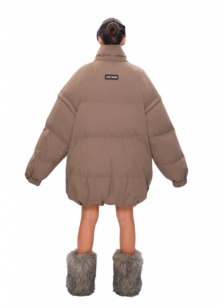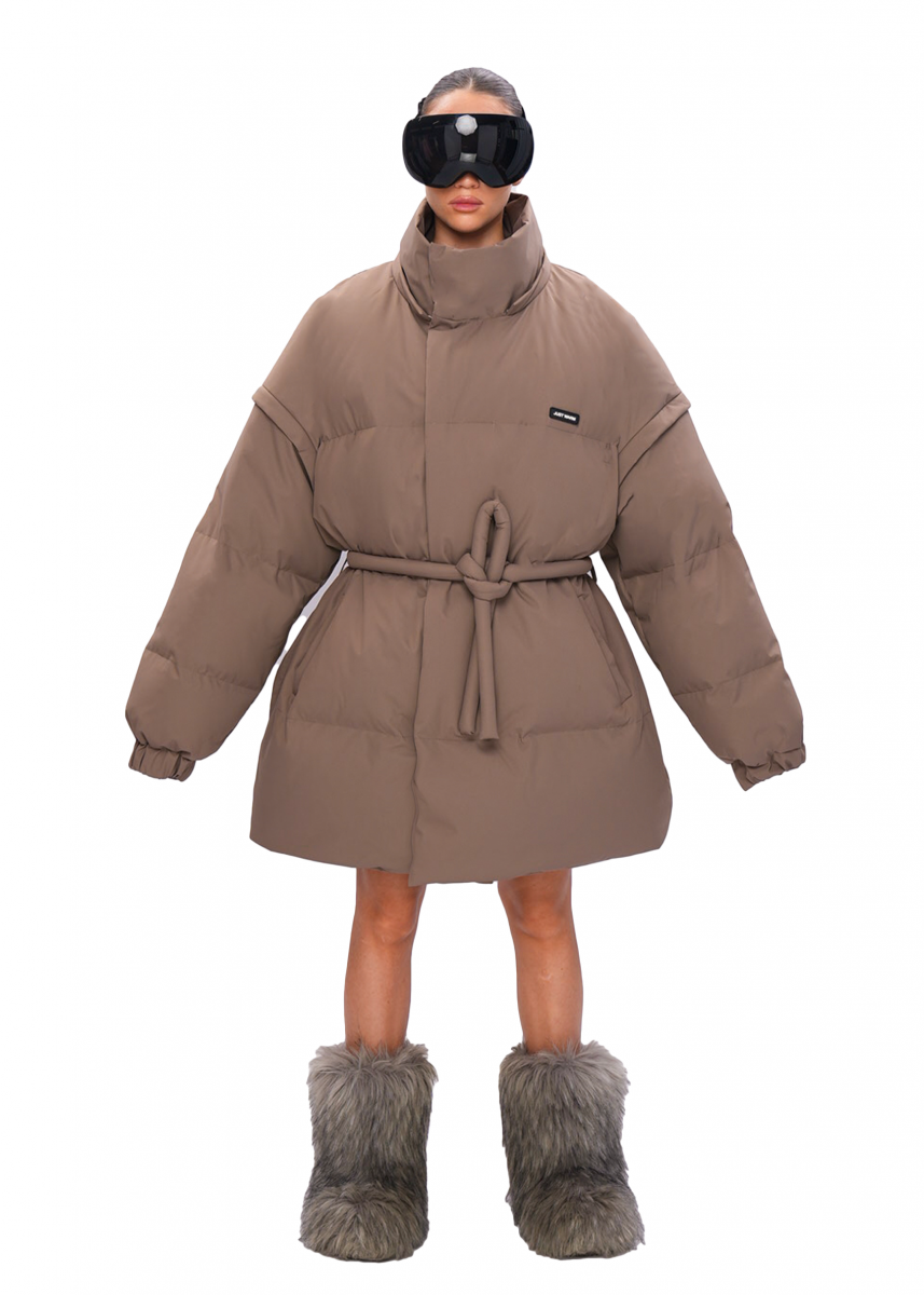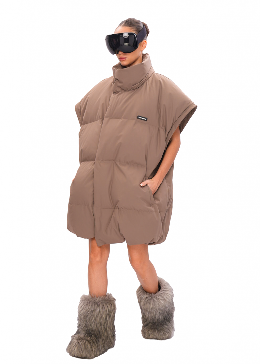 Непродуваемый пуховик имеет super oversized силуэт, а также оснащен высоким воротником, съемными рукавами, внутренними карманами и объемным непродуваемым капюшоном.