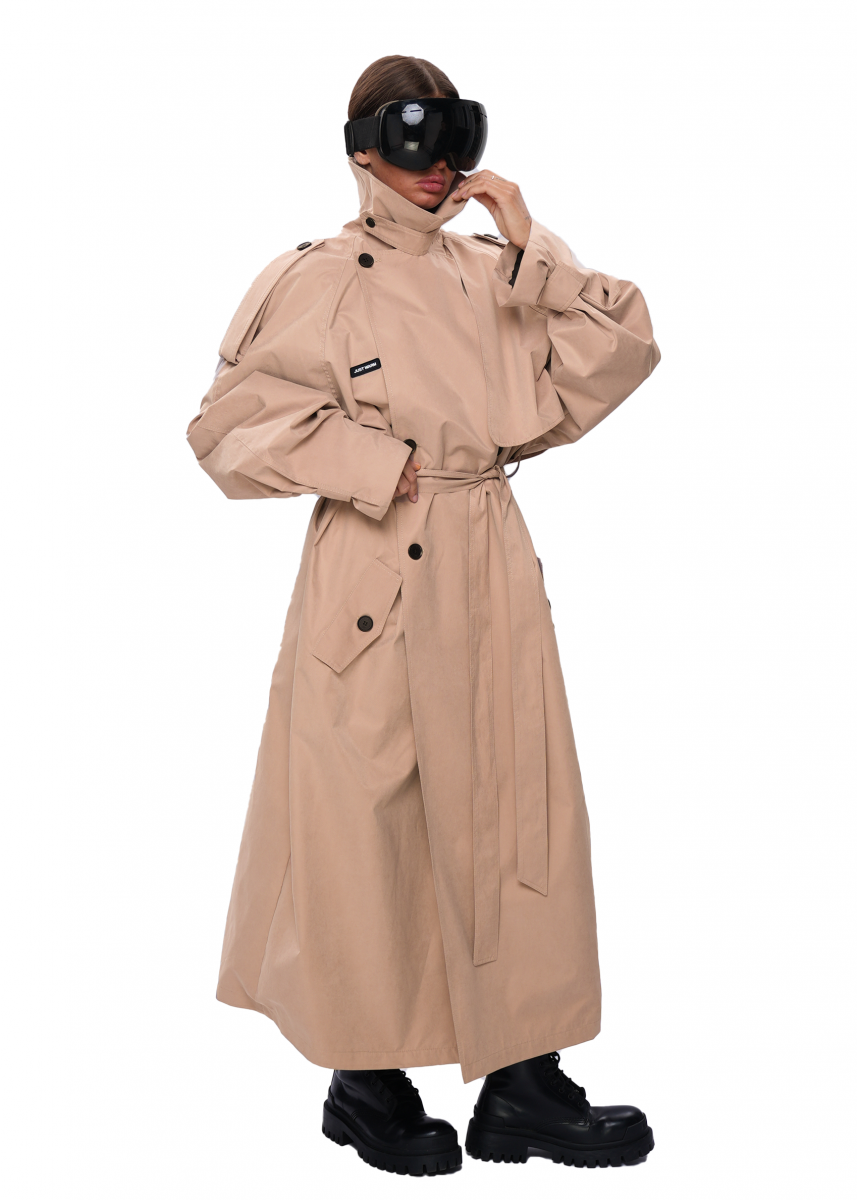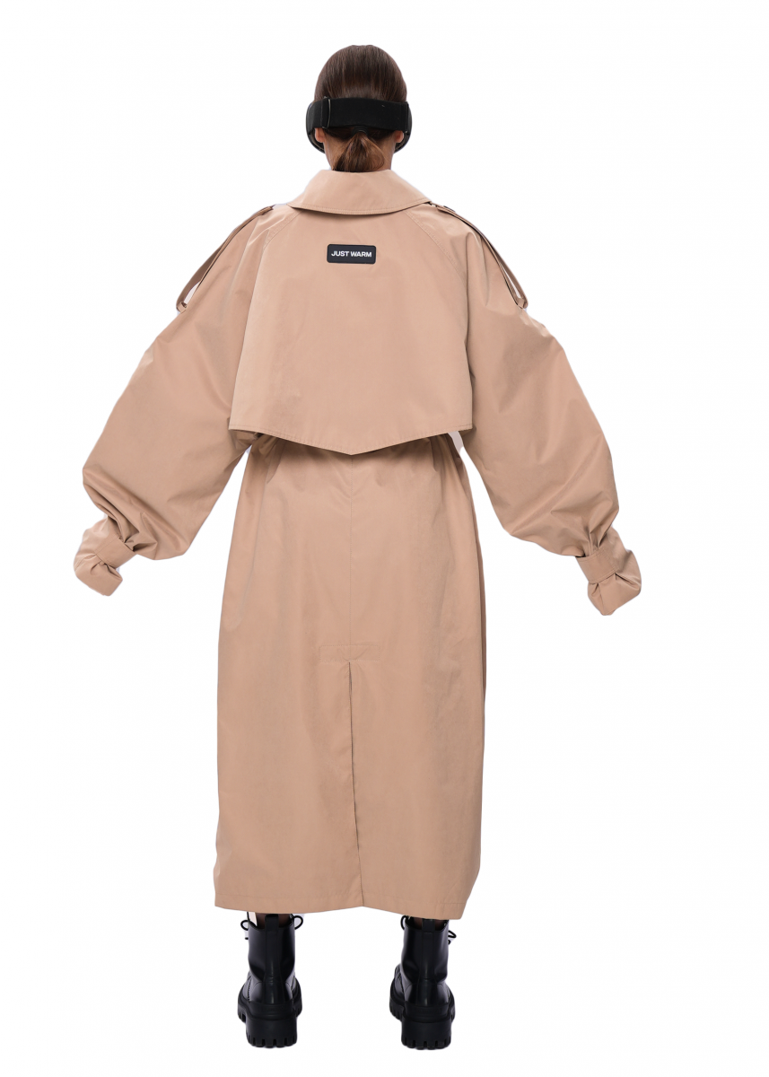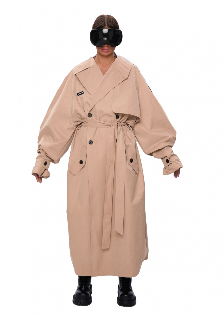 Тренч VOLUME выполнен из плащевой ткани с peach-эффектом — материал мягкий, приятный на ощупь и комфортный в носке. Модель имеет OVERSIZE-силуэт и свободную посадку.